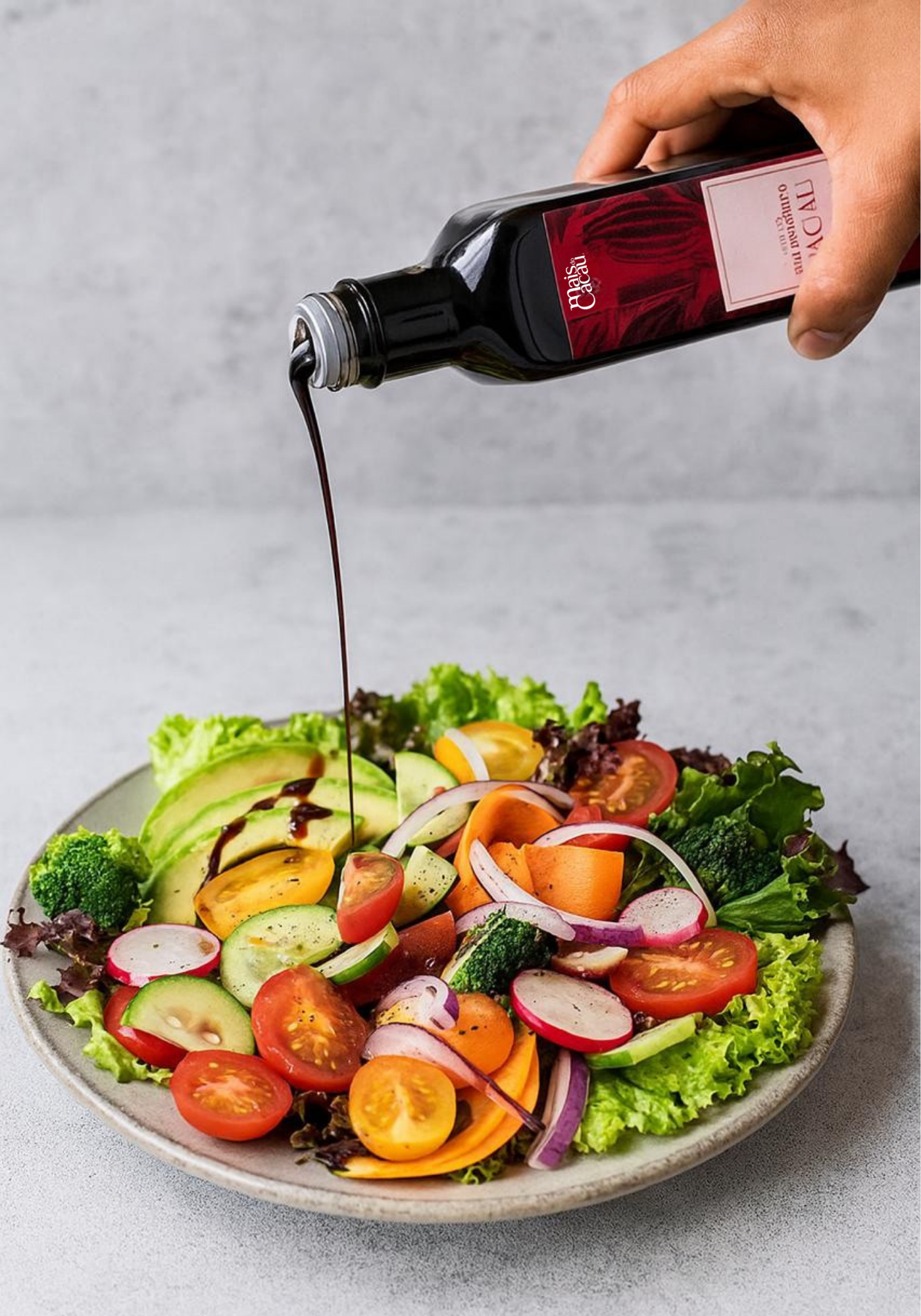 Vinagre Balsâmico de cacau elaborado a partir do mel de cacau e envelhecido em barril de carvalho.